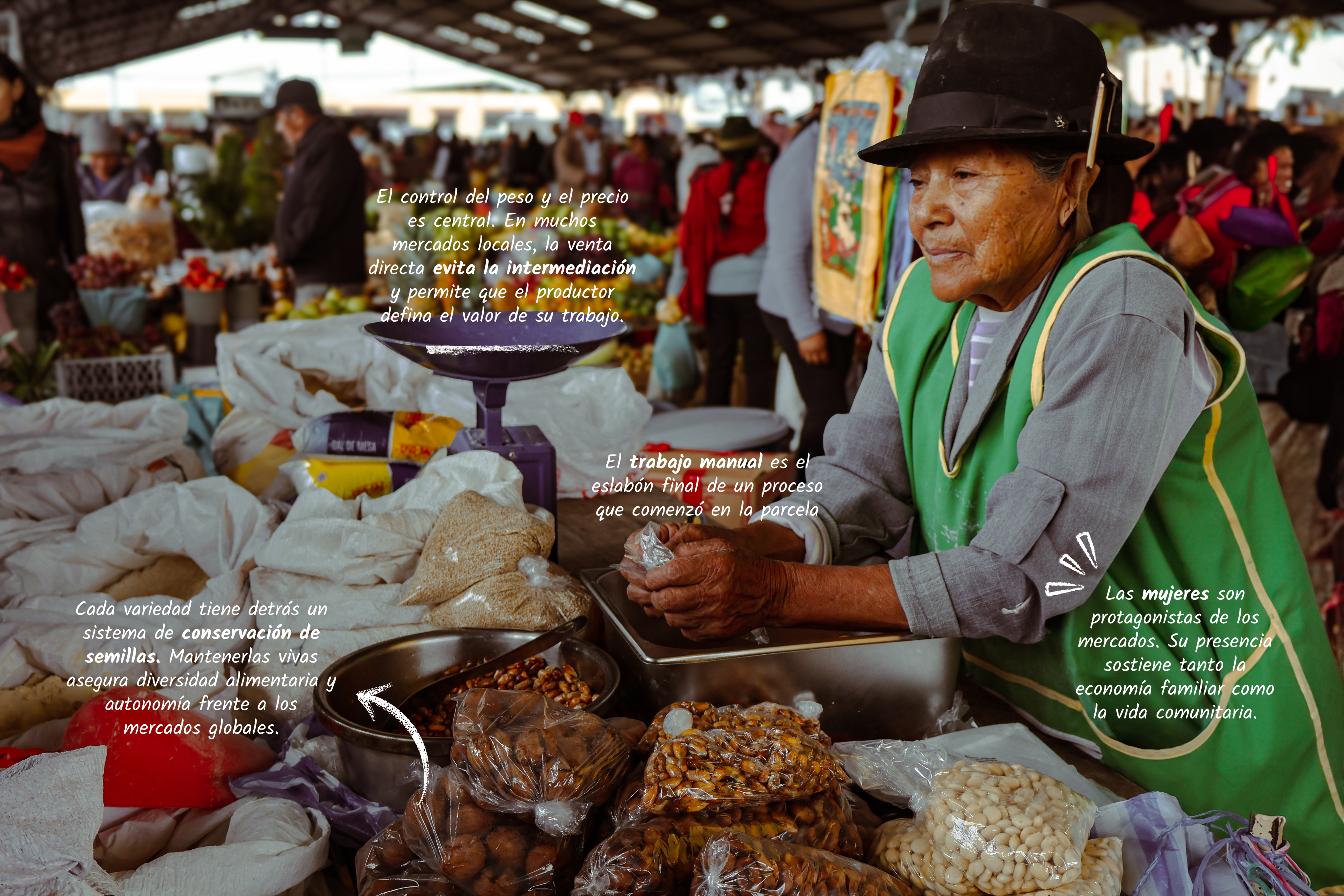 En las provincias andinas, la vida campesina está marcada por la fragmentación de las tierras y por un acceso desigual a los mercados. Durante décadas, las familias han tenido que vender sus productos a intermediarios en mercados mayoristas, recibiendo precios bajos y quedando sujetas a condiciones inestables. Esto ha debilitado su capacidad de sostenerse y de valorar su producción agroecológica.